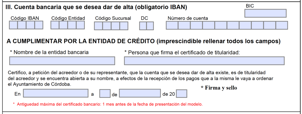 Si dispone de un certificado de titularidad de datos bancarios emitido por una entidad de banca online, convenientemente firmado y sellado, o en su caso con firma electrónica de la entidad bancaria, deberá rellenar el número de cuenta y los datos disponibles en el certificado.