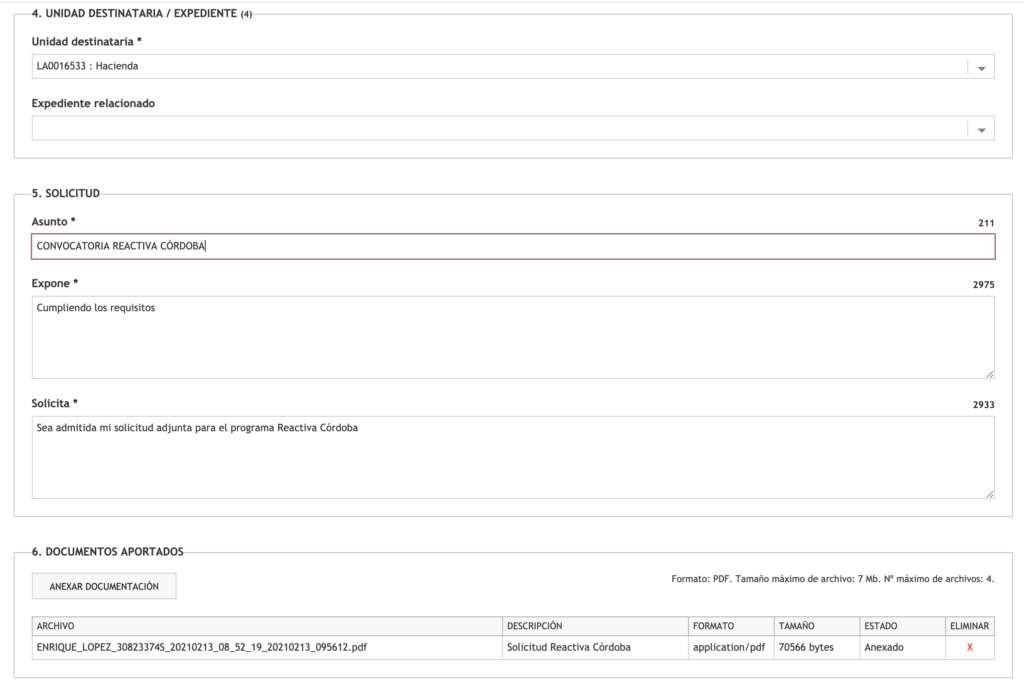 • En el campo resumen se indicará: CONVOCATORIA REACTIVA CÓRDOBA
